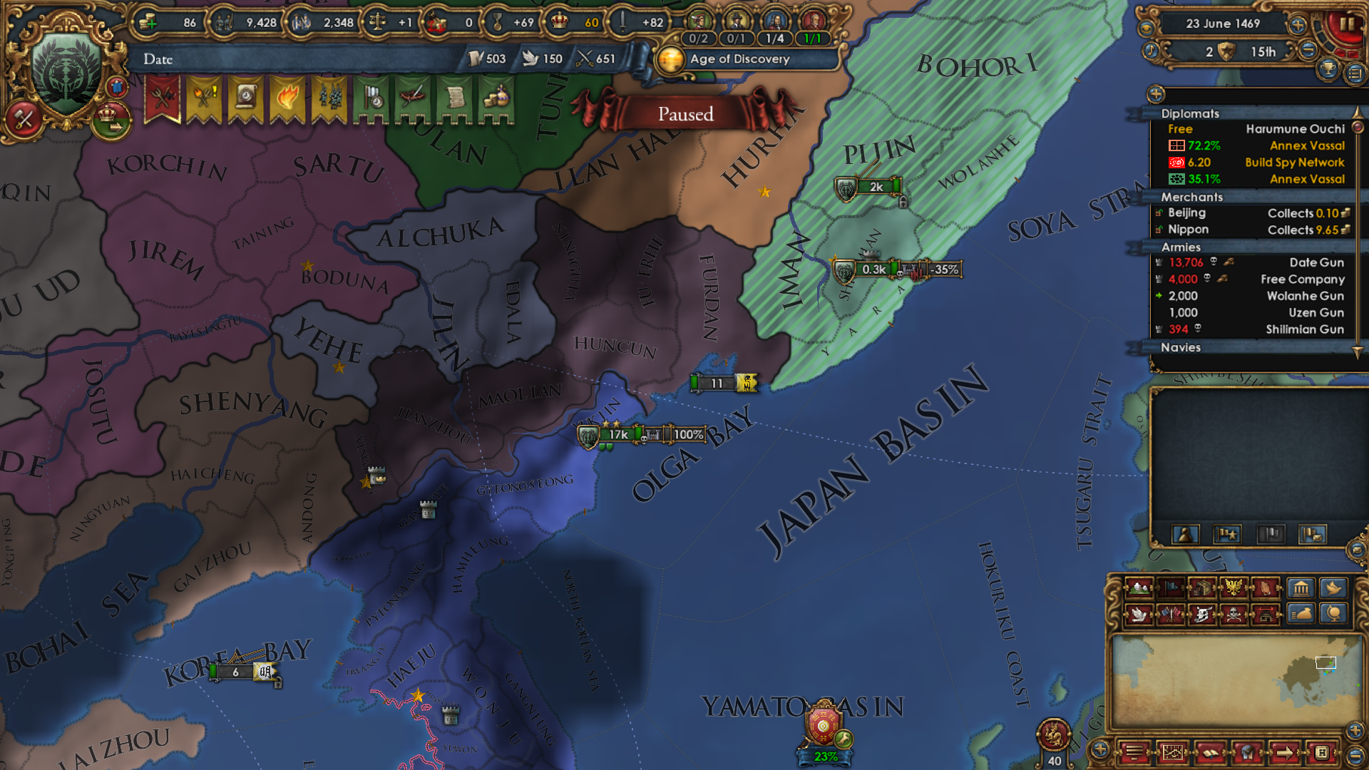 It's nice when the game takes on a life of it's own, it's pretty rare that I feel forced to make a choice at this point in the game. My Alaska colony was maybe the 6 northernmost provinces in the Cascadia region. It was a tiny thing with a small gold province that I only really did because the game gives you colonists. However, Portuguese Cascadia (which owned the rest of the region) would not stop attacking Alyaska. Every time I ended up in a war with the Ottomans, Ming, or Europe, they'd attack. Once I was able to Enforce Peace, but two or three times, I had to deliberately fail at it and fight Portugal just to save my colony.